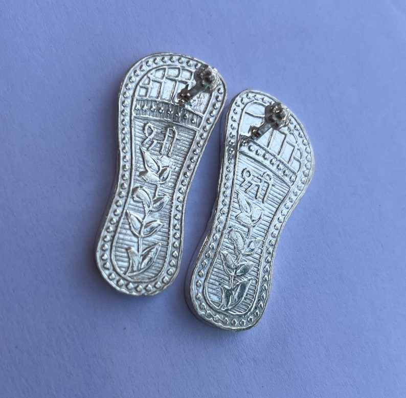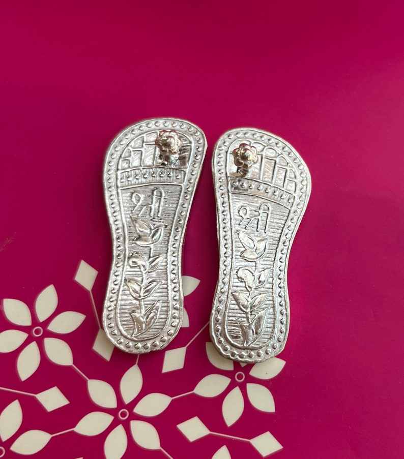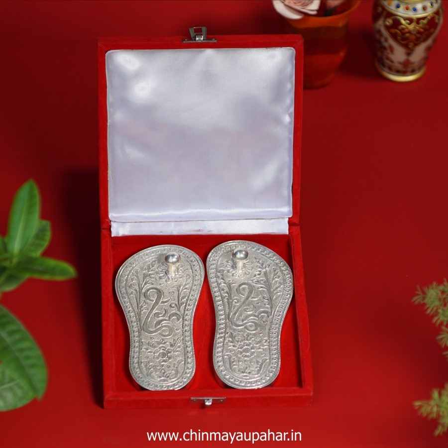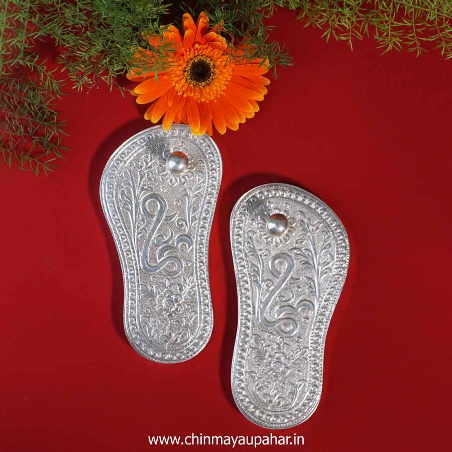 Silver Plated Shree Ram Ji Charan Invoke the divine blessings of Lord Ram. Meticulously crafted from premium polyresin, this 2-inch idol captures the holy feet of the Lord of Ayodhya, elegantly adorned with intricate carvings and symbols.